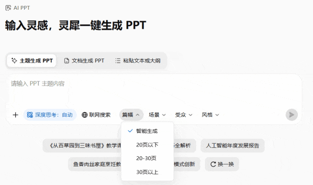 但生成的最终的 PPT 结果一般,你能够选择篇幅长短、合用场景,![]()